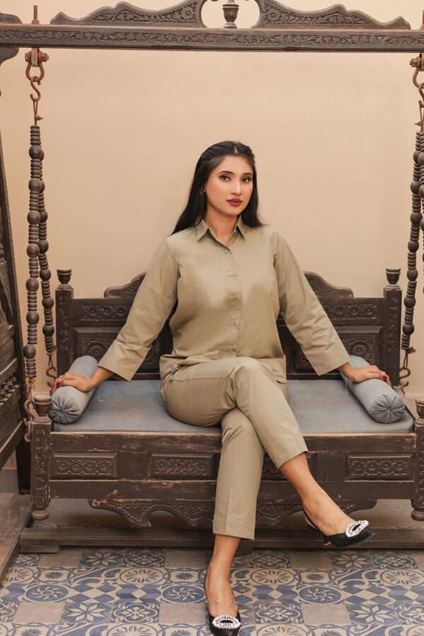 1. Effortless Elegance: The Casual Creamy Green Cord Set Outfit exudes effortless elegance with its coordinated shirt and pent ensemble, making it an ideal choice for a variety of casual outings.